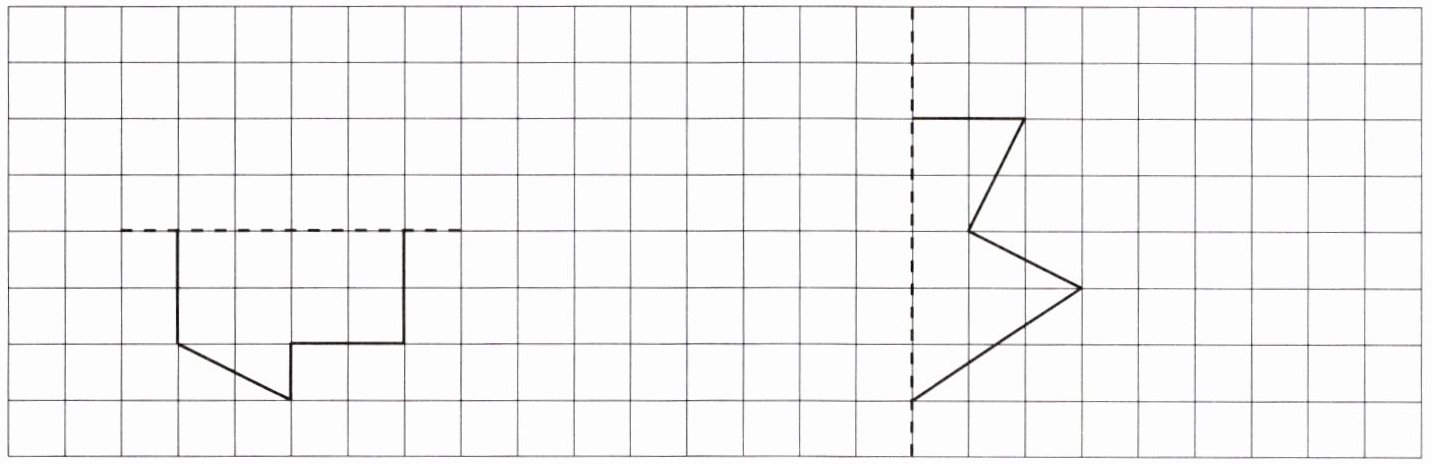例如,左边图形最下方的顶点,测量其到对称轴(水平虚线)的垂直距离,然后在对称轴另一侧相同距离处确定其对称点;右边图形最右侧的顶点,测量其到对称轴(竖直虚线)的水平距离,然后在对称轴另一侧相同距离处确定其对称点。