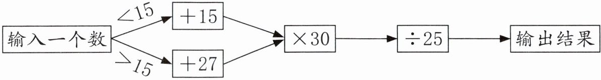 (5) 下图是丁丁设计的一个程序,当输入的数是23时,输出的结果是();当输出的结果是24时,输入的数是()。(输入的数不为15)