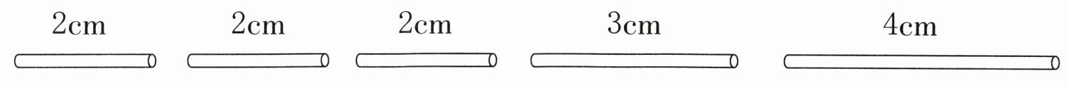 4. 从下面 5 根小棒中任意取出 3 根,摆出不同形状的三角形,你能摆出几种?分别是什么三角形?