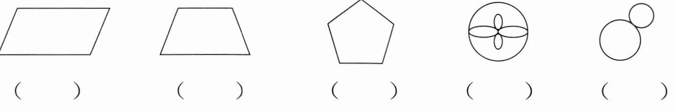 【答案】:( )( )(√ )(√ )( ) ,正五边形对称轴$5$条(画法:过一个顶点和对边中点的直线),第四个图形对称轴$4$条(画法:过圆心且互相垂直的两条直线)。