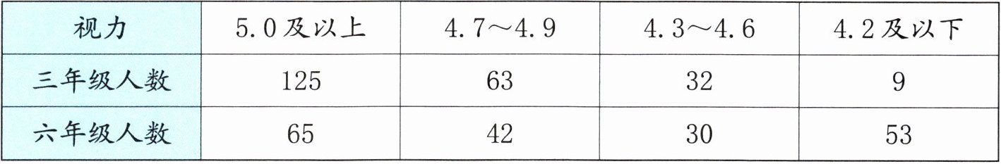 (2)三年级同学视力低于5.0的有()人,六年级同学视力低于5.0的有()人。