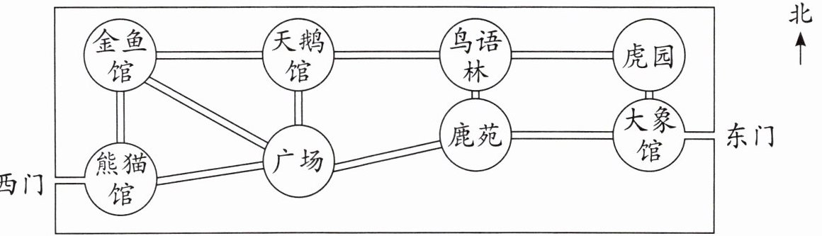 例:由东门进入,向西走到大象馆,再向北走到虎园,再向西走到鸟语林,再向南走到鹿苑,再向西南走到广场,再向北走到天鹅馆,再向西走到金鱼馆,再向南走到熊猫馆,最后向西走出西门。