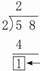 (1)解决“把 58 本课外书平均分给两个班,求每个班分到多少本”这个问题时,右图竖式中的“1”表示( )。