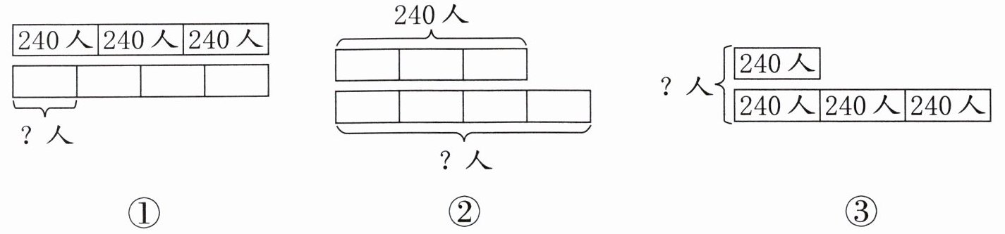 (3)解决“运动会开幕式上迎面走来的 3 个同样的方阵共有 240 人,求 4 个这样的方阵有多少人”这个问题时,下面三种画图方法符合题意的是( )。