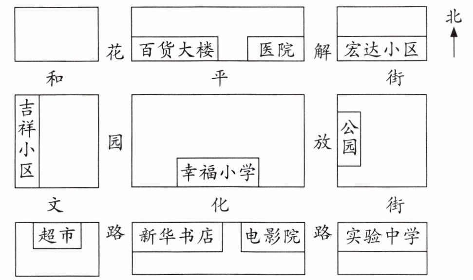 (3) 小丽家在吉祥小区,她要去公园,可以先沿着文化街向()走,再沿着解放路向()走;还可以先沿着和平街向()走,再沿着解放路向()走。