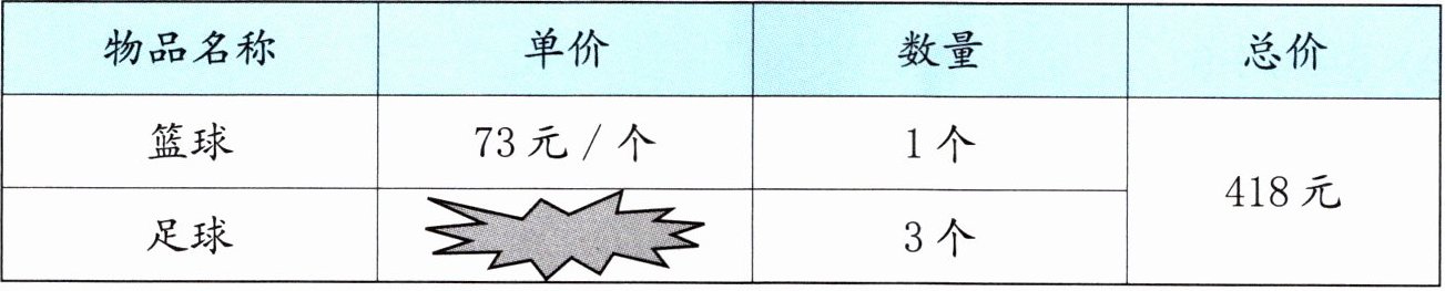 8. 明明不小心把购买体育用品的单据弄脏了。请你根据表格中的信息帮明明算出足球的单价。