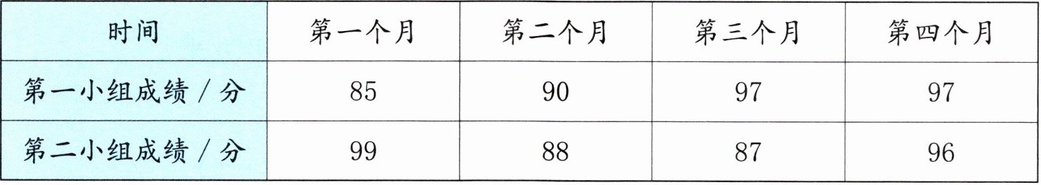 (2)答案不唯一,如:该活动中心准备安排一个小组参加社区比赛,安排哪个小组更合适? 安排第一小组更合适,因为第二个月、第三个月、第四个月的成绩都比第二小组高,且呈上升趋势。