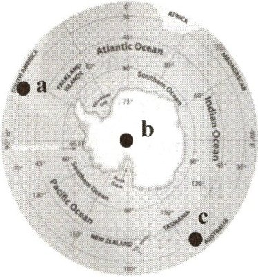 1. 细节理解题。根据“Bees can live all over the world except in very cold places.”可知蜜蜂除了在非常寒冷的地方,世界各地都能生存。图中$b$处是南极,属于非常寒冷的地方,没有蜜蜂;$a$和$c$处不是寒冷之地,有蜜蜂。