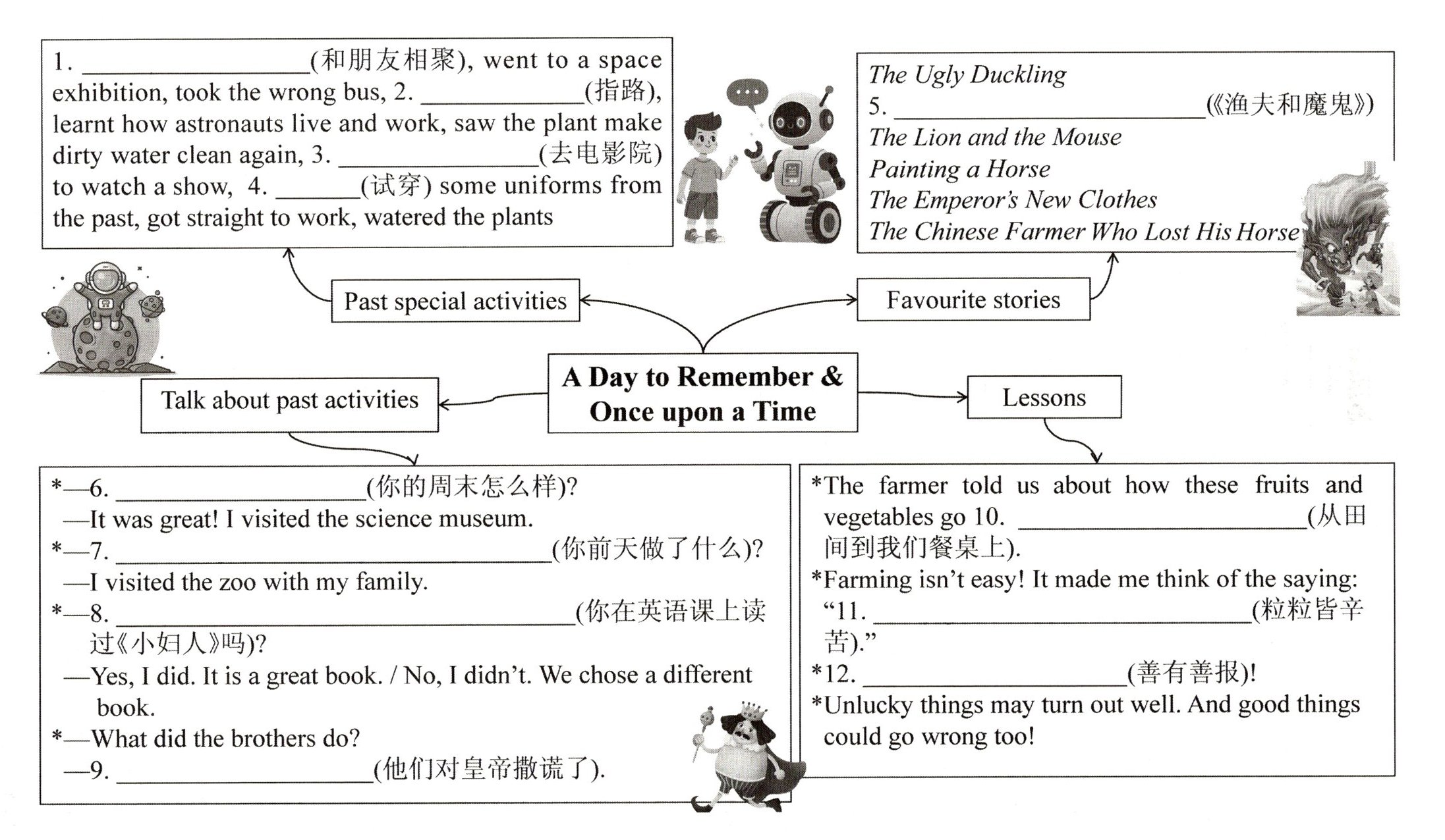 1. got together with friends2. showed the way3. went to the cinema4. tried on5. The Fisherman and the Genie6. How was your weekend7. What did you do the day before yesterday8. Did you read *Little Women* in English class9. They lied to the emperor10. from the fields to our tables11. Every grain is the fruit of hard work12. One good turn deserves another