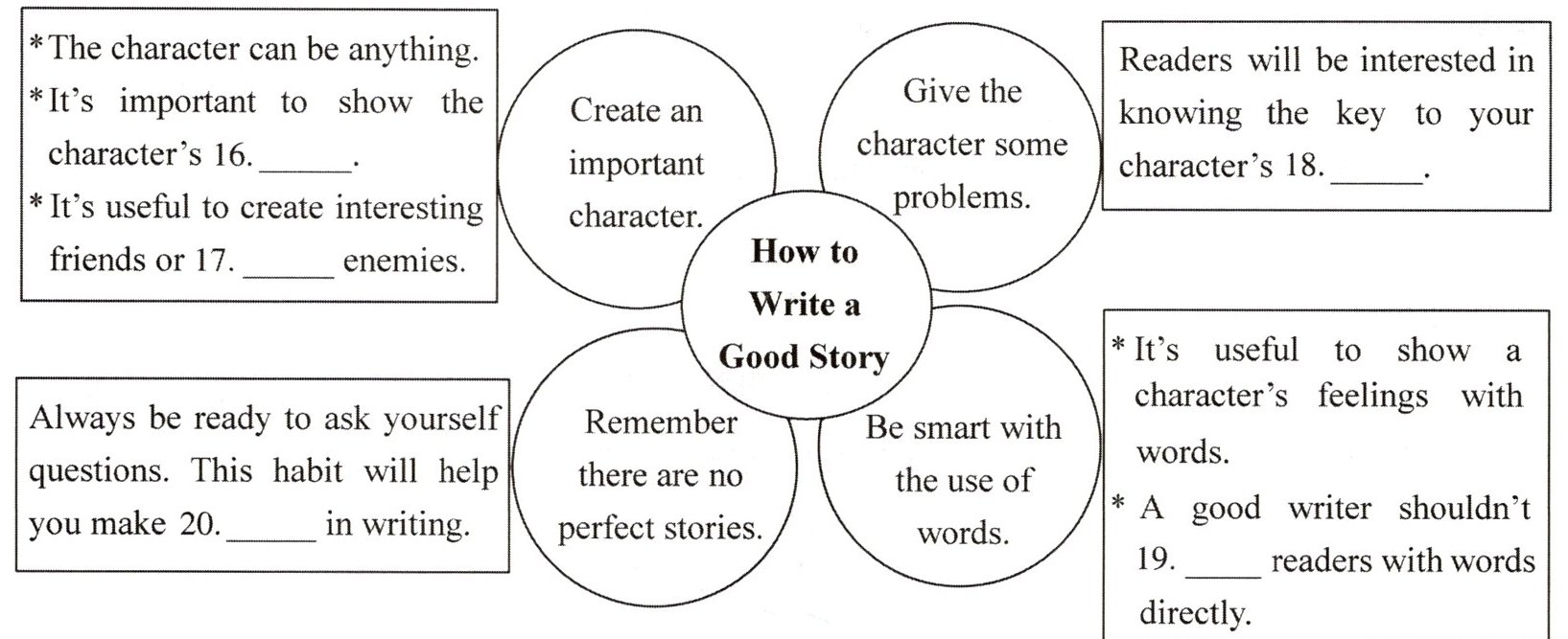 Let's start by having an important character. The character can be anything, like a person, an animal, or even a genie! It may be smart, playful, kind and so on. But as the story goes on, you need to make the character "grow up" because it experiences more things. In the end, the character will be different from what he was like at the start. Create interesting friends or enemies(敌人) with great power for the character to make your story more colourful.