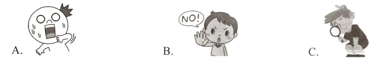 51. “refused”意思是“拒绝”,B选项图片中人物说“NO!”表示拒绝,A选项是害怕的表情,C选项是在观察,所以B选项符合“refused”的意思。