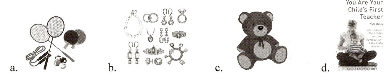 47. 海报中提到“Clothes, toys, books, sports things or anything else for students are here.”,a是运动用品(球拍等),c是玩具(小熊),符合可售卖物品;b是首饰,d是书籍(从封面看不是学生相关书籍),不符合。