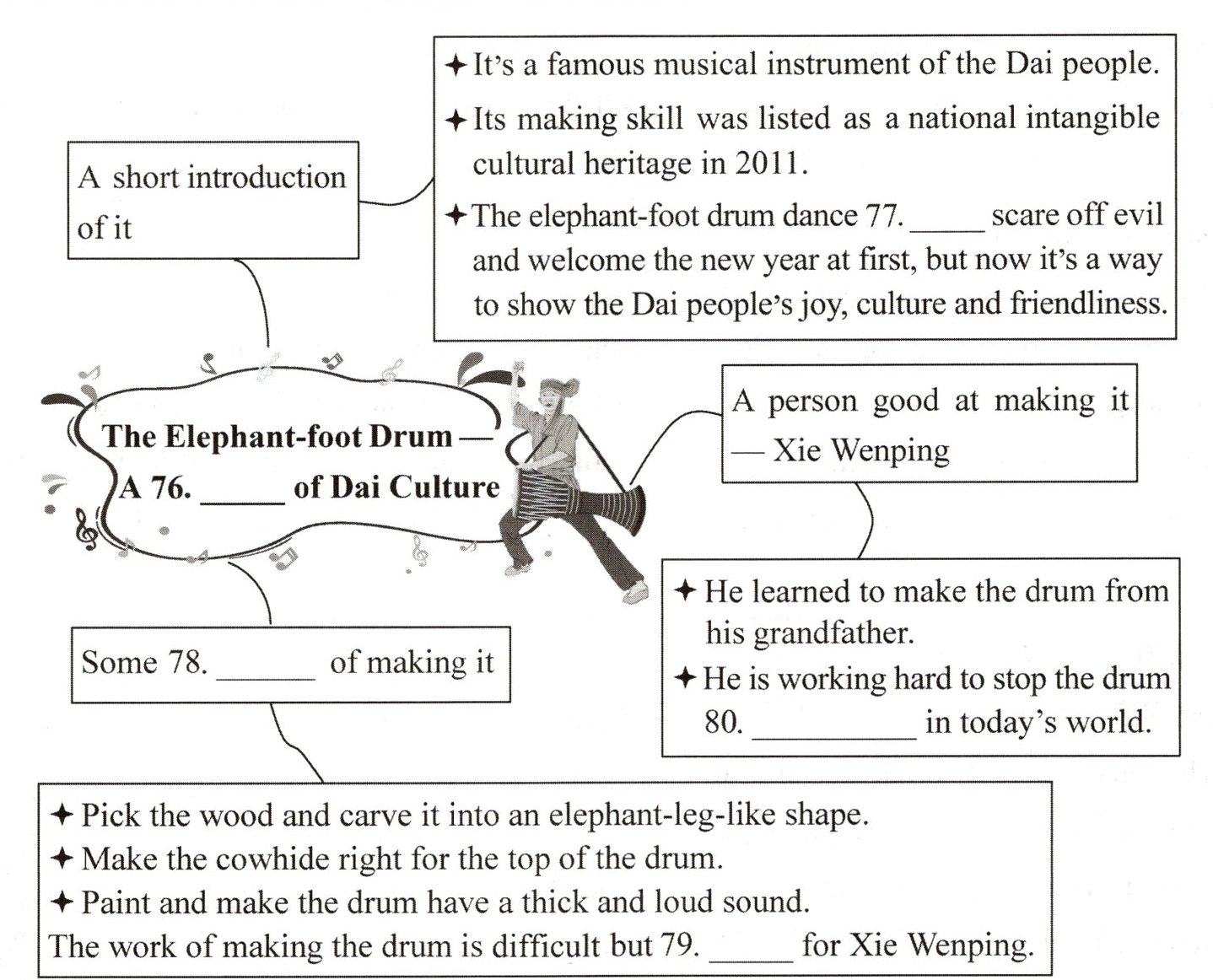 80. 根据“Over the years, the number of people skilled in making elephant-foot drums has become smaller,” Xie said. “I feel like I must carry it on. I am thinking about how I can let more people know about it.”可知他努力不让象脚鼓消失,“disappear”有“消失”之意。