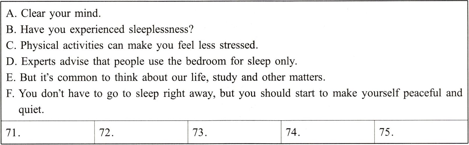 71. 前文提到很多人睡不好,后文说“如果是这样”,B选项“Have you experienced sleeplessness?”(你经历过失眠吗?)符合语境,起到承上启下的作用。
