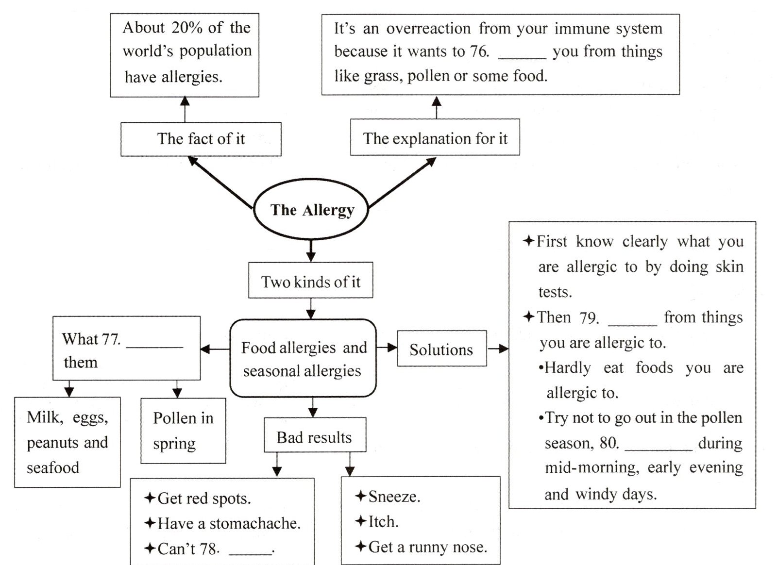 79. 依据最后一段“Once you know what you are allergic to, the best thing to do is to try not to get close to those things.”可知是要“远离”过敏的东西,“keep/stay away from”表示“远离”,所以填“keep/stay away”。