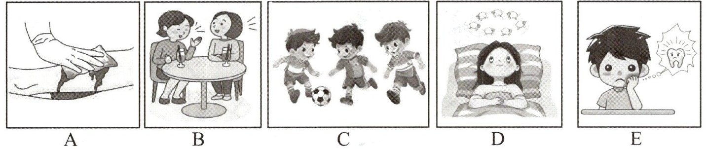 7. 句子也许提到了牙齿方面,E图是孩子牙疼,与之对应。