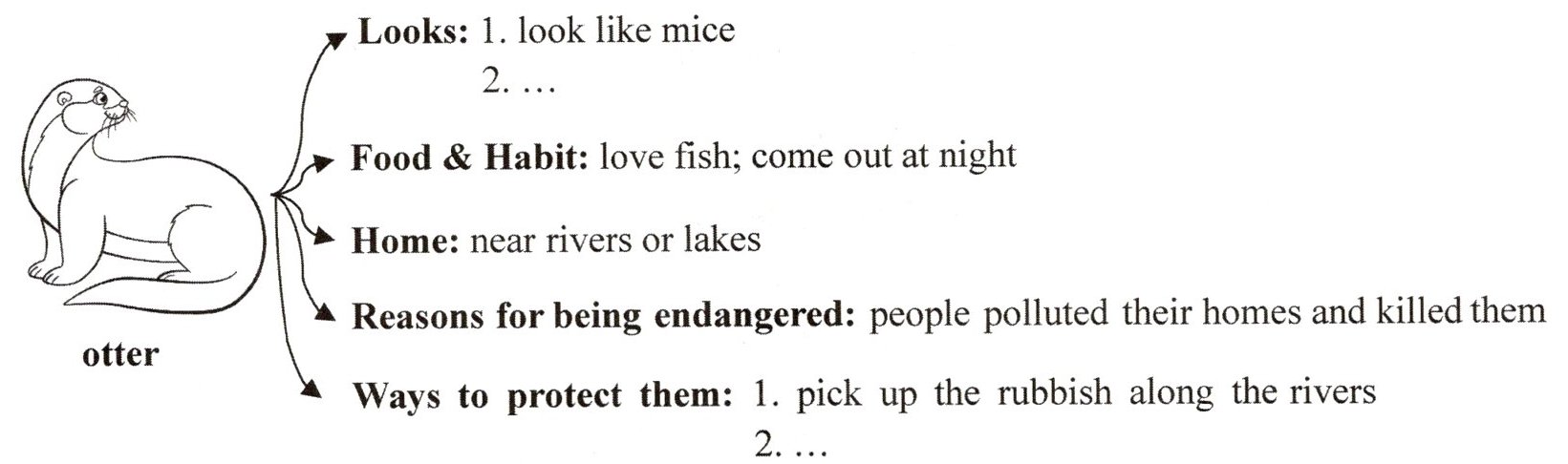 Otters belong to second - level national protected wild animals. They look like mice and have short legs and long tails. Otters love fish and come out at night. They live near rivers or lakes. But now they are endangered. Because people polluted their homes and killed them. We should do something to protect them. We can pick up the rubbish along the rivers. Also, we can set up more protection areas for them. Let's work together to protect these lovely otters.