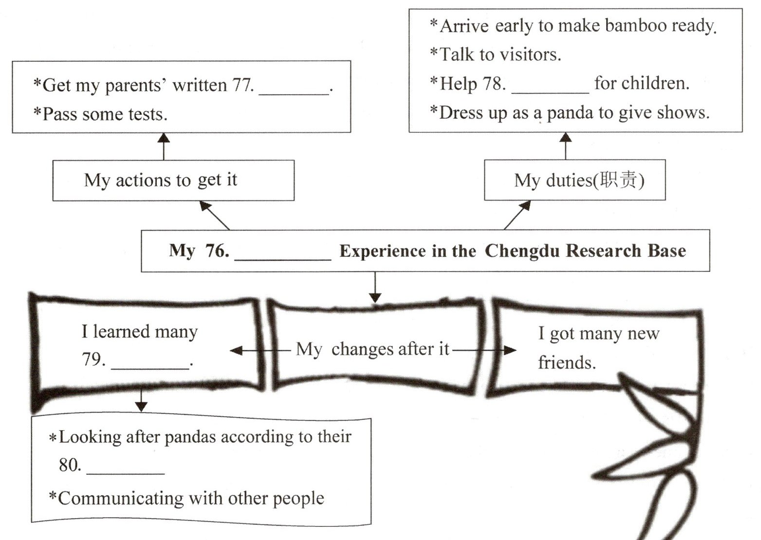 79. 从后文可知学到了照顾熊猫和与人交流等“技能”,“skills”符合。