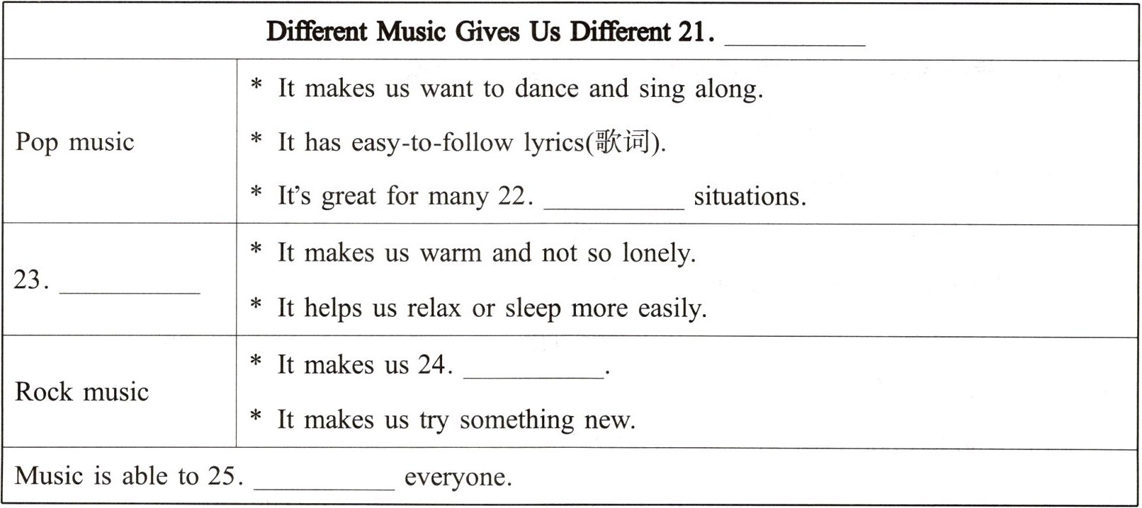 21. 短文围绕不同音乐给我们的影响展开,结合表格内容可知是“感受/影响”,“feelings/effects”符合语境。