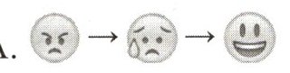 1. 约翰一开始打破杯子很害怕(对应害怕的表情),找不到扫帚簸箕时很苦恼(对应苦恼的表情),最后在邻居帮助下清理干净很开心(对应开心的表情),所以是害怕→苦恼→开心,C选项符合。
