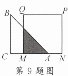 9. 如图,已知等腰直角三角形ABC的直角边长与正方形MNPQ的边长均为10cm,CA与MN在同一条直线上,点A从点M开始向右移动,设点A的移动距离为xcm(0≤x≤20),重叠部分的面积为S(单位$:cm^2).$
