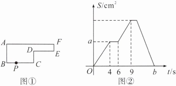 (2) 已知当 P 在 BC 上时, 以 AB 为底的高在不断增大, 到达点 C 时, 开始不变, 由图②得, P 在 BC 上移动了 4 s, 那么 $ BC = 4 \times 2 = 8 $ (cm). 在 CD 上移动了 2 s, $ CD = 2 \times 2 = 4 $ (cm), 在 DE 上移动了 3 s, $ DE = 3 \times 2 = 6 $ (cm), 而 $ AB = 6 $ cm, 那么 $ EF = AB - CD = 2 $ cm