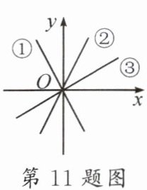 11. 如图,三个正比例函数的图象分别对应解析式:①$y = a x$,②$y = b x$,③$y = c x$,将$a$,$b$,$c$从小到大排列并用“$<$”连接为____.