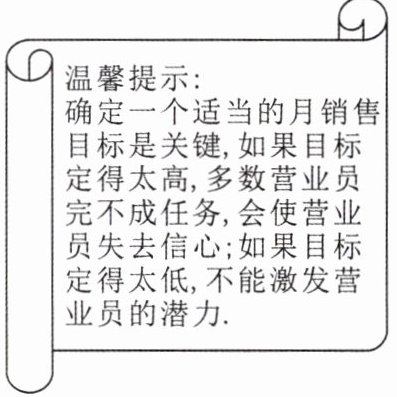确定一个适当的月销售目标是关键,如果目标完成得太高,多数营业员完不成任务,会使营业员失去信心;如果目标定得太低,不能激发营业员的潜力.