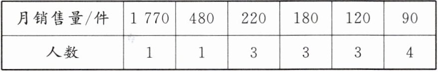 (2)如果想让一半左右的营业员都能达到销售目标,平均数、中位数、众数中,中位数最适合作为月销售目标.理由如下:因为中位数为 180,月销售量大于和等于 180 件的人数超过一半,所以中位数最适合作为月销售目标,有一半以上的营业员能达到销售目标