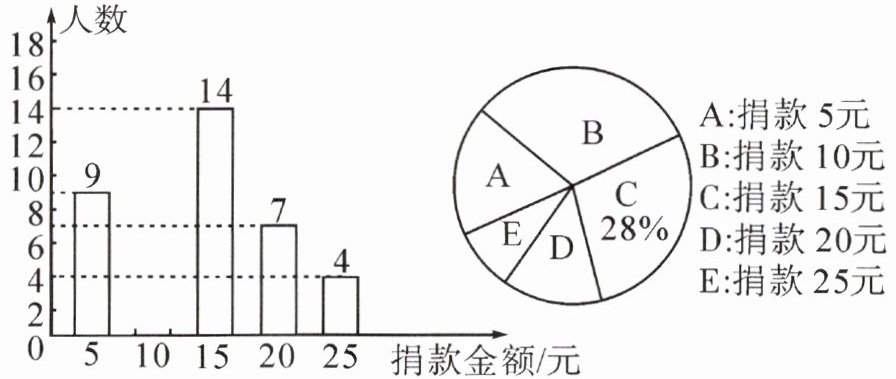 (2)抽取的同学捐款金额的众数是 10(元),中位数是 $(10 + 15)÷2 = 12.5$ (元)