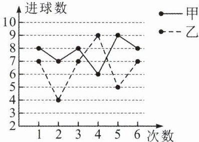8. 如图是甲、乙两人 6 次投篮测试(每次投篮 10 个)成绩的统计图,甲、乙两人测试成绩的方差分别记作 $s_{甲}^{2}$、$s_{乙}^{2}$,则 $s_{甲}^{2}$____$s_{乙}^{2}$.(填“>”“=”或“<”)