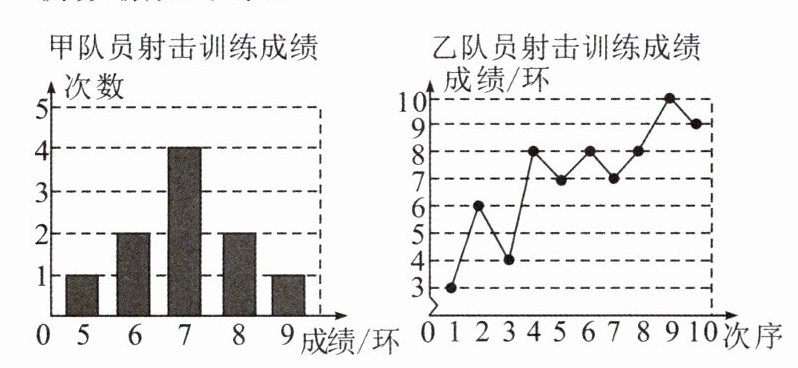 12. 甲、乙两名队员参加射击训练,成绩分别被制成下列两个统计图.根据统计图信息,整理分