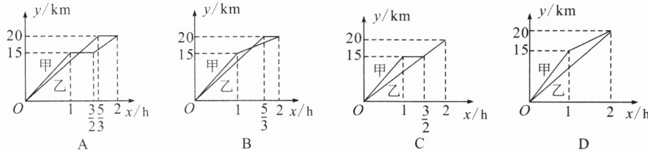 3.一段笔直的公路$AC长20km$,途中有一处休息点$B$,$AB长15km$,甲、乙两名长跑爱好者同时从点$A$出发,甲以$15km/h的速度匀速跑至点B$,原地休息半小时后,再以$10km/h的速度匀速跑至终点C$;乙以$12km/h的速度匀速跑至终点C$,下列选项中,能正确反映甲、乙两人出发后2时内运动路程$y$(单位:$km$)与时间$x$(单位:$h$)函数关系的图象是 ()