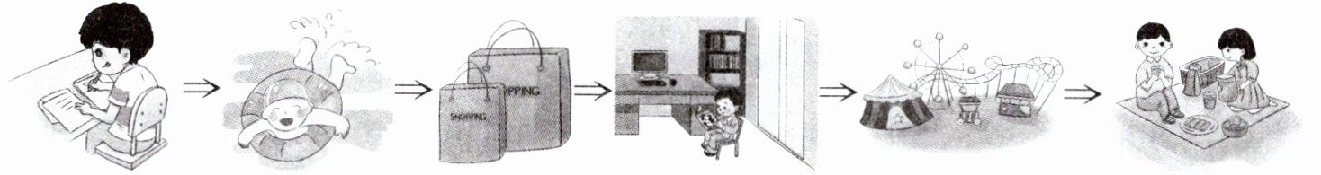 四、看图,观察李华暑假第一周的安排,按时间顺序给下列句子排序。(首句已给出)