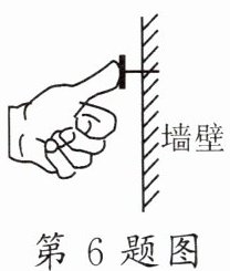 6. 如图所示,图钉尖的面积是 $1×10^{-7}m^{2}$,图钉帽的面积是 $1×10^{-4}m^{2}$,墙壁表面能承受的最大压强是 $4×10^{6}Pa$,手指必须用大于______ $N$ 的压力,图钉尖才能进入墙壁。图钉静止时,手对钉帽的压力______(选填“大于”“等于”或“小于”)墙对钉尖的支持力。