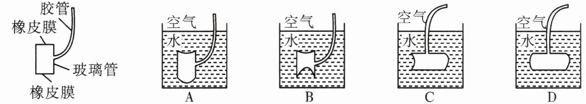 2. 如图所示,玻璃管两端开口处蒙的橡皮膜绷紧程度相同,将此装置置于水中,下列能正确反映橡皮膜受到水的压强后的凹凸情况的图是()