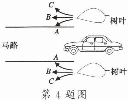 4. 我们经常看到这样的现象:在无风的天气,汽车在马路上快速驶过以后,马路两边的树叶会随风飘动。如图所示,汽车向左行驶,马路两边的树叶会沿着A、B、C哪一个方向飘动?()