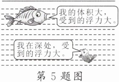 5. 如图所示,大鱼和小鱼的争论中,______(选填“大鱼”或“小鱼”)的说法正确,这是因为两条鱼浸没在同种液体中,它们所受到的浮力的大小与______无关。