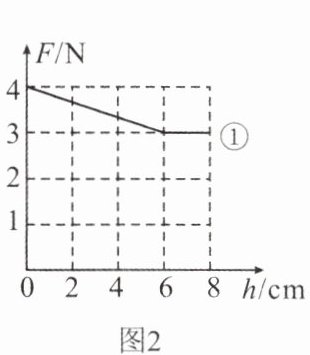 (1)小明利用图1甲所示的实验装置,将圆柱体合金块慢慢浸入水中时,根据测得的实验数据,作出了弹簧测力计示数$F_{示}$与合金块下表面所处深度h的关系图像(如图2中①所示)。实验过程中合金块所受浮力的变化情况是______。请在图2中画出$F_{浮}$随h变化的关系图像,分析图像可知,浸在水中的物体所受浮力的大小跟它排开水的体积成______。