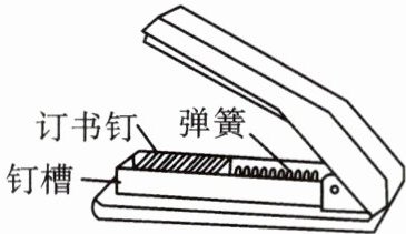 9. 如图所示是一种常见的订书机,钉槽内的订书钉之所以不会松脱,是因为固定在槽内后部的弹簧给钉子一个向____的____力。在使用过程中,随着钉子的减少,弹簧给钉子的这个力将____(选填“增大”“减小”或“不变”)。