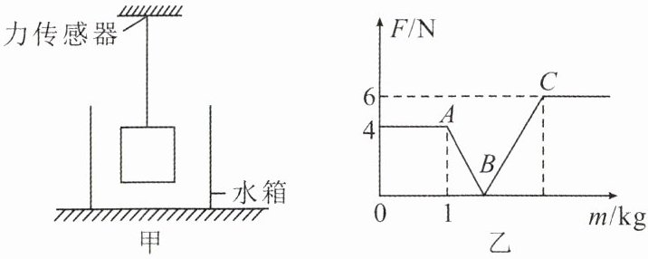 9. 如图甲所示,竖直细杆(质量不计)的上端通过力传感器连在天花板上,力传感器可以显示出细杆上端受到作用力的大小;下端与正方体物块相连。现向底面积为$0.02m^{2}$、质量为1kg的薄壁空水箱中加水,力传感器的示数大小随水箱中加入水质量变化的图像如图乙所示(g取10N/kg)。根据图中信息,向水箱内加入水的质量为______kg时,物块所受浮力最大;当传感器示数刚达到6N(C点)时,水箱对桌面的压强为______Pa。