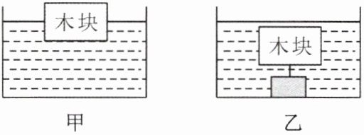 9. 如图甲所示,一长方体木块的质量为 0.12 kg,高为 4.0 cm。将木块平稳地放在水面上,静止时木块露出水面的高度为 2.0 cm。如图乙所示,利用金属块和细线,使木块浸没水中且保持静止状态。已知水的密度$ρ_{水}= 1.0×10^{3}kg/m^{3}$,g 取 10 N/kg,求: