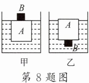 8. 在一个圆柱形容器内盛有 20 cm 深的水。现将一质量为 200 g 的密闭空心铁盒 A 放入水中时,空心铁盒有一半浮出水面;当铁盒上放一个小磁体 B 时,铁盒恰好浸没水中,如图甲所示;当把它们倒置在水中时,A 有$\frac {1}{15}$的体积露出水面,如图乙所示。那么小磁体 B 的密度为____$kg/m^{3}$。(g 取 10 N/kg)