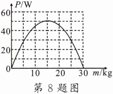 8. 王波同学帮奶奶搬家,现有 $ 30 $ 捆书籍,每捆书籍的质量都为 $ 5 \, \text{kg} $。王波想尽快将它们搬上 $ 10 \, \text{m} $ 高处的新家。如图是王波可以提供的用于搬运物体的功率与被搬运物体质量之间的关系图像。由图可知,为了尽可能快地将这批书籍搬上新家,他每次应搬______捆。若每次下楼时间是上楼时间的一半,则他最快完成搬运任务并返回原地,所用的总时间为______ $ \text{s} $。($ g $ 取 $ 10 \, \text{N/kg} $)