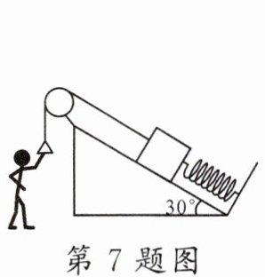 7. 如图所示是一款健身拉力器原理图,斜面的倾角为 $ 30^{\circ} $,重 $ 500 \, \text{N} $ 的物块与固定在斜面底端的弹簧相连,小明通过定滑轮拉着物块沿斜面向上匀速运动 $ 2 \, \text{m} $ 的过程中(此过程弹簧始终处于被拉伸状态),小明对绳的拉力所做的功为 $ 1000 \, \text{J} $,克服弹簧拉力做功 $ 300 \, \text{J} $,则克服物块重力做的功为______ $ \text{J} $,物块与斜面之间摩擦力的大小为______ $ \text{N} $。(忽略绳重、滑轮与轴的摩擦)