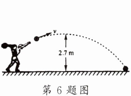6. 在体育考试中,小明投出的实心球在空中的运动轨迹如图所示。若实心球重 $ 20 \, \text{N} $,从最高点到落地点的过程中,球下降的高度为 $ 2.7 \, \text{m} $,用时约 $ 0.75 \, \text{s} $。则球下降过程中重力做功为______ $ \text{J} $,功率为______ $ \text{W} $。