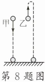 8. 甲、乙是两个完全相同的网球。如图所示,在同一高度同时以大小相等的速度,将甲球竖直向下抛出、乙球竖直向上抛出,不计空气阻力。抛出时两球机械能______(选填“相等”或“不相等”);落地前的运动过程中,甲球的动能______(选填“增大”“不变”或“减小”),乙球的机械能______(选填“增大”“先增大后减小”“不变”或“减小”)。