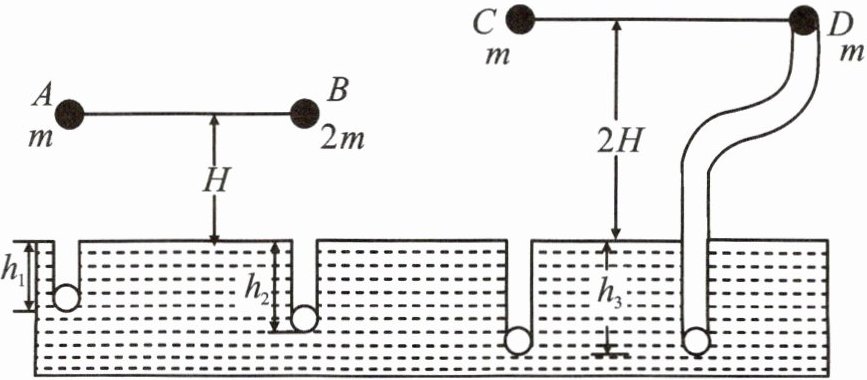 9. 某同学在体育活动中,从铅球下落陷入沙坑的深度情况猜想到:物体的重力势能可能与物体的质量、下落高度和运动路径有关。于是设计了如图所示的实验:用大小、形状相同的A、B、C、D四个铅球,其中A、C、D三球的质量为m,B球质量为2m,让A、B两球从距沙坑表面高H处静止下落,C球从距沙坑表面高2H处静止下落,D球从距沙坑表面高2H的光滑弯曲管道上端由静止滑入,最后从管道下端竖直落下(球在光滑管道中运动的能量损失不计)。实验测得A、B两球陷入沙坑深度分别为$h_1$和$h_2,C、$D两球陷入沙坑深度均为$h_3,$且$h_1 < h_2 < h_3。$