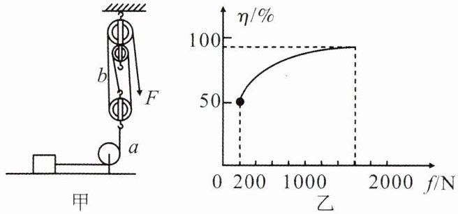 10. 某兴趣小组用如图甲所示的滑轮组(物体与动滑轮用绳子a连接)匀速拉动放在同一水平面上的不同物体,物体受到的摩擦力从200N开始逐渐增加,直到组装滑轮组的绳子b被拉断,每次物体拉动的距离均为2m。通过实验绘出了该滑轮组机械效率随物体受到摩擦力大小变化的关系图像如图乙所示(不计绳重和绳与滑轮间的摩擦)。求: