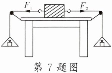 7. 如图所示是研究“二力平衡条件”的实验装置,木块两端小盘里加上______的砝码时,木块便保持静止,这说明二力平衡条件:作用在物体上的二力必须______,方向相反,并且在同一直线上;若两盘里的砝码质量相等,把木块扭转一个角度后松手,发现木块______,这是由于木块所受的两个拉力$F_{1}$、$F_{2}$______。